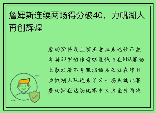 詹姆斯连续两场得分破40,力帆湖人再创辉煌